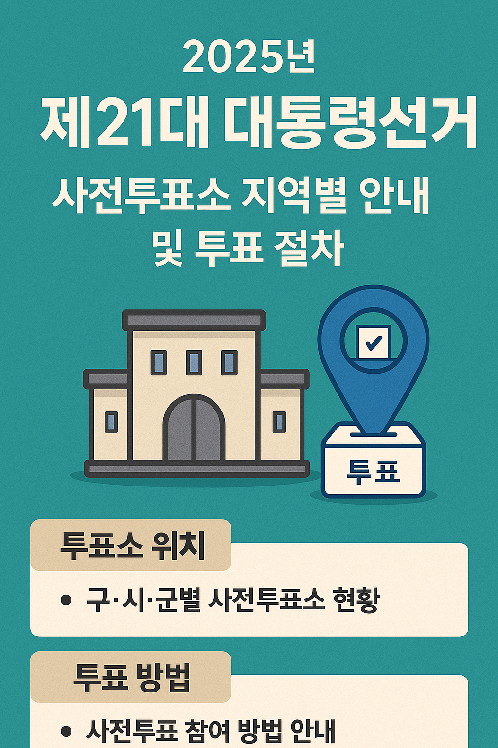 다가오는 2025년 제21대 대통령선거의 사전투표가 5월 29일(목)과 5월 30일(금) 이틀간 진행됩니다. 사전투표는 거주지와 상관없이 전국 어디서나 투표할 수 있는 편리한 제도로, 소중한 한 표를 미리 행사할 수 있는 기회입니다. 이 글에서는 지역별 사전투표소 위치, 투표 절차, 준비물 등을 상세히 정리했습니다. 중앙선거관리위원회의 최신 정보를 바탕으로 작성되었으며, 투표소 위치는 5월 14일 이후 공개됩니다.